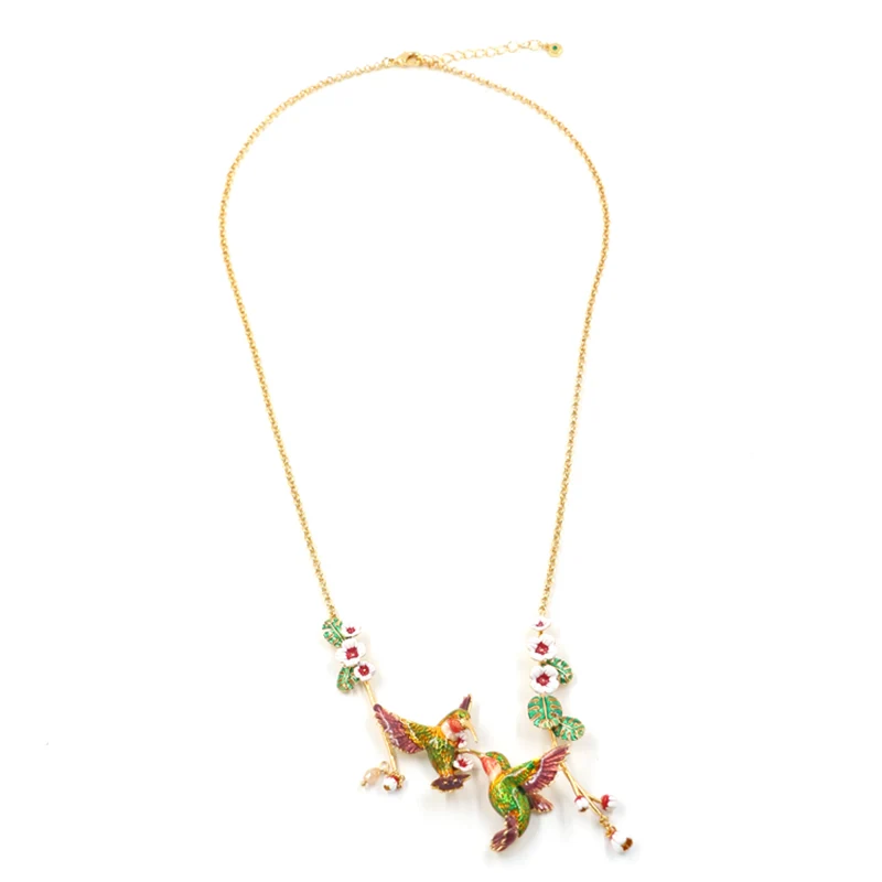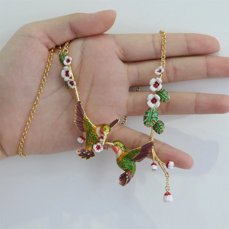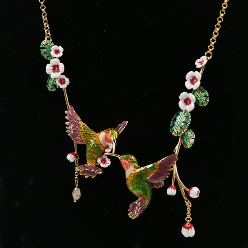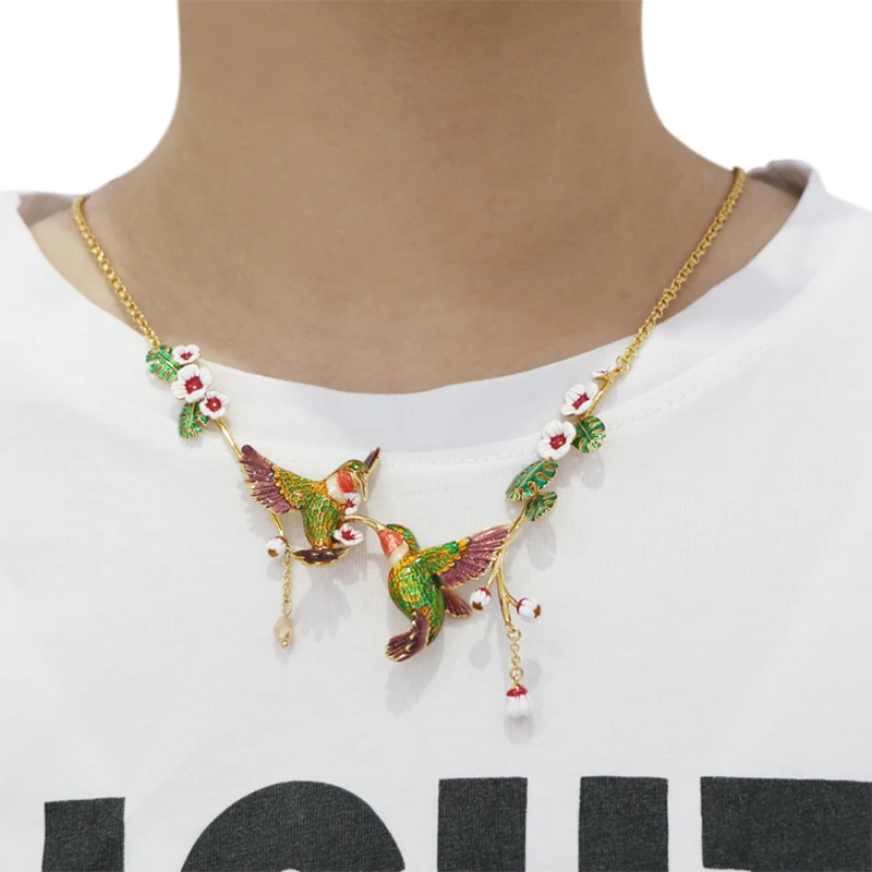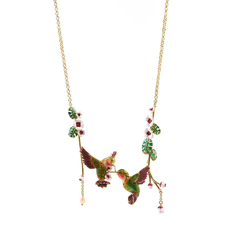 Med två olivgröna unika kolibrier trimmade med Weigela hortensis, tar detta dubbla kolibrihalsband med Weigela hortensis dig tillbaka till det pittoreska landskapet i trädgården och dekorerar din garderob.